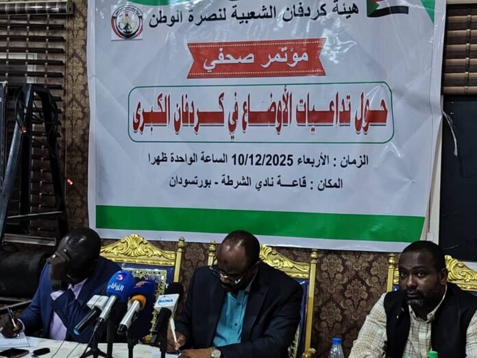 وطالب عبدالله خلال مؤتمر صحفي نظمته هيئة كردفان الشعبية لنصرة الوطن ببورتسودان امس بدار الشرطة قيادة الدولة بأن يوفروا مطلوبات القتال والعمل على انشاء متحرك درع كردفان أسوة ببقية المناطق التي تم تحريرها والعمل على الاستفادة من المقاومة الشعبية والذين تم تدريبهم من الجنود، وسخر من الذين يتحدثون عن الإنسانية قائلا:”انظروا لما حدث في كالوغي من قتل للأطفال، ونقول للمجتمع الدولي تحملوا مسؤوليتكم والإمارات يجب أن تتوقفوا وحان الوقت لرد الصاع صاعين” وأعلن عن دعمهم للقوات المسلحة حتى آخر جندي، وقطع انهم لن تهزمهم دانات المليشيا ولن يركعون لها.